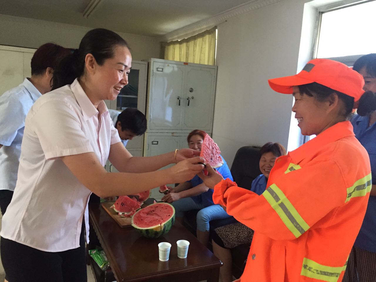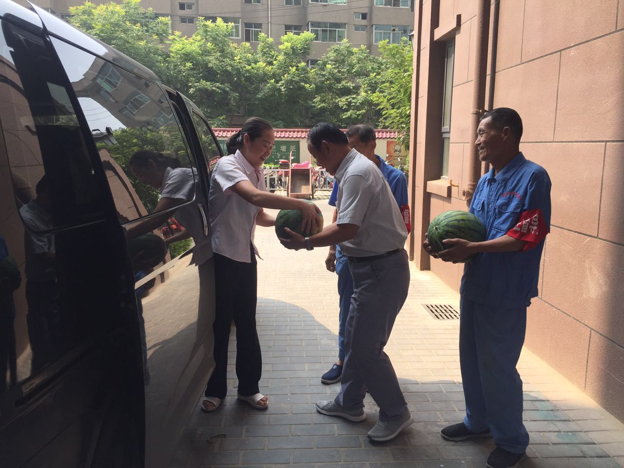 當(dāng)日上午,總經(jīng)理趙明海、工會主席常紅艷等人一行來到河南街、安谷苑、九冶、城投時代進(jìn)行慰問,向一線職工送去800余斤西瓜。慰問組每到一處,親切詢問保安保潔的生活情況和工作狀況,叮囑他們要注意防暑降溫,并對保安保潔近期以來的勤懇勞動表示感激和關(guān)懷之情,叮囑他們在開展“創(chuàng)文”整治工作以來,保潔員隊(duì)伍人員少、天氣熱、任務(wù)重的情況下,在提高小區(qū)環(huán)境質(zhì)量的同時,要做好遮陽等保護(hù)措施,注意勞逸結(jié)合,預(yù)防中暑。
